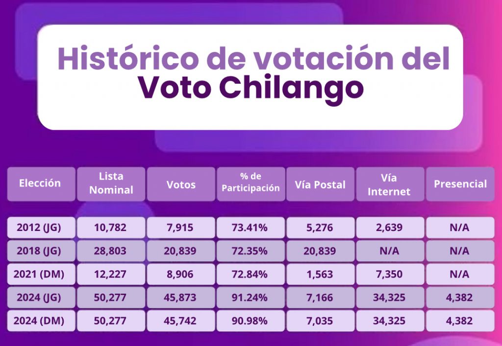 En 2012 había una lista nominal de 10,782 chilangos en el extranjero de los cuales participó el 73.41% (7,915):